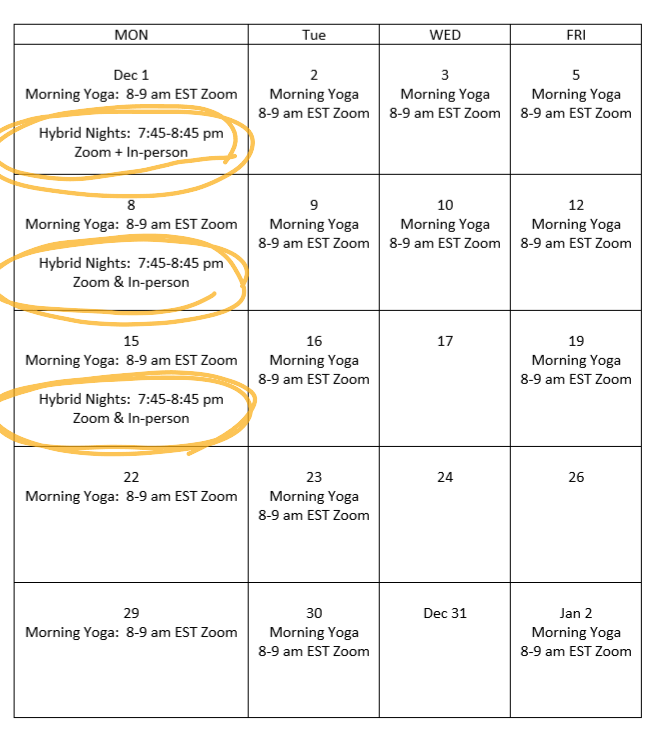 Note: No evening classes on Dec 22, 29. We’ll resume on Jan 5.