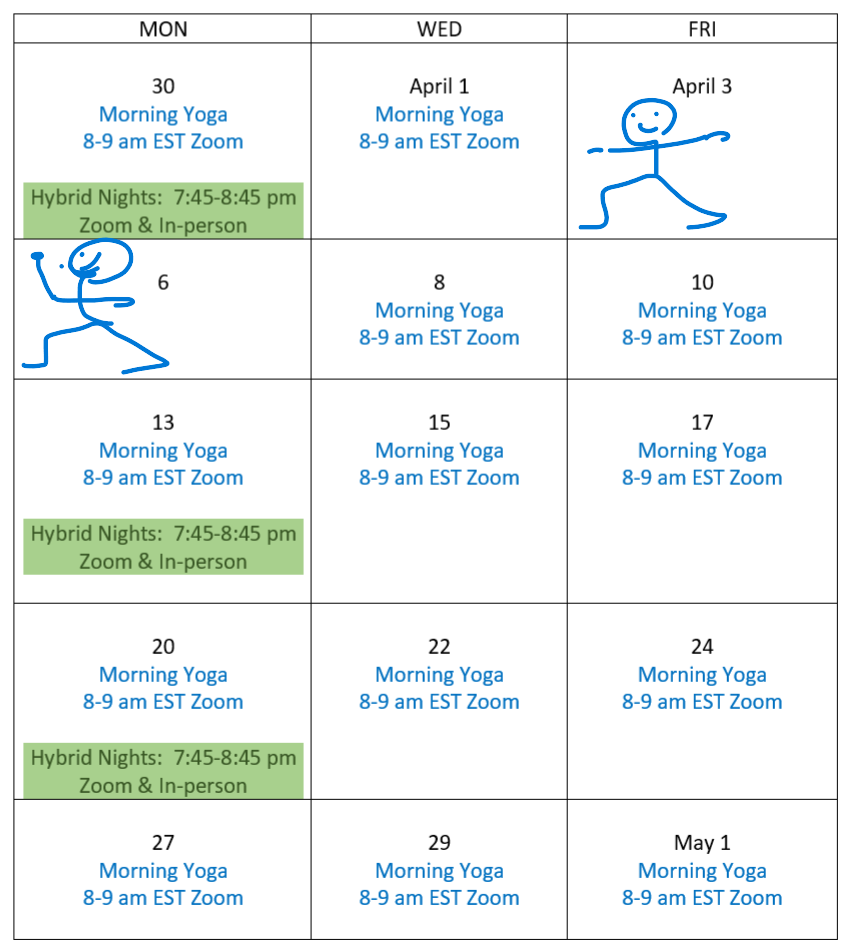 Note: No morning yoga on Fri April 3 nor Mon April 6.